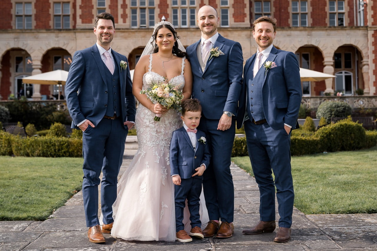 David, the groom, looked effortlessly stylish in a custom-fitted blue suit from Moss Bros. His groomsmen complemented the look in matching light blue tweed. Their sophisticated attire perfectly matched the refined ambience of Easthampstead Park. Before the ceremony, I encourage the groom to walk calmly with their friends. David did just that, sharing stories and laughter, which eased his nerves and added warmth to their enchanting wedding day.